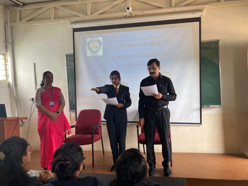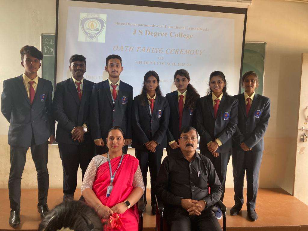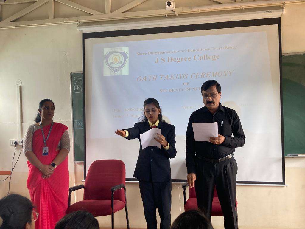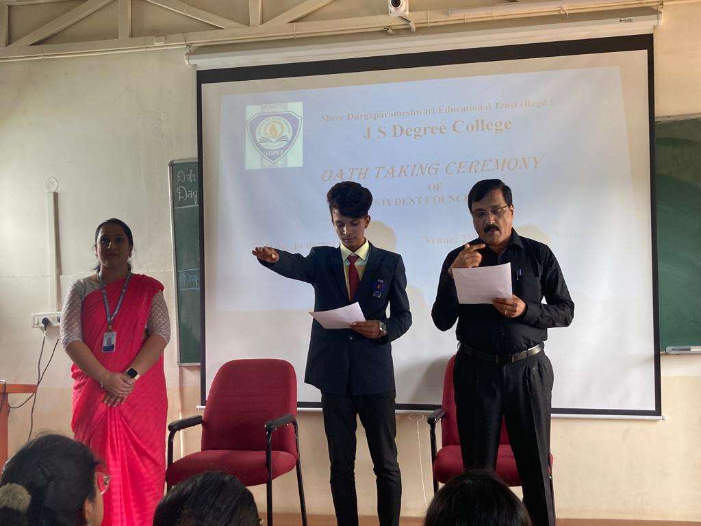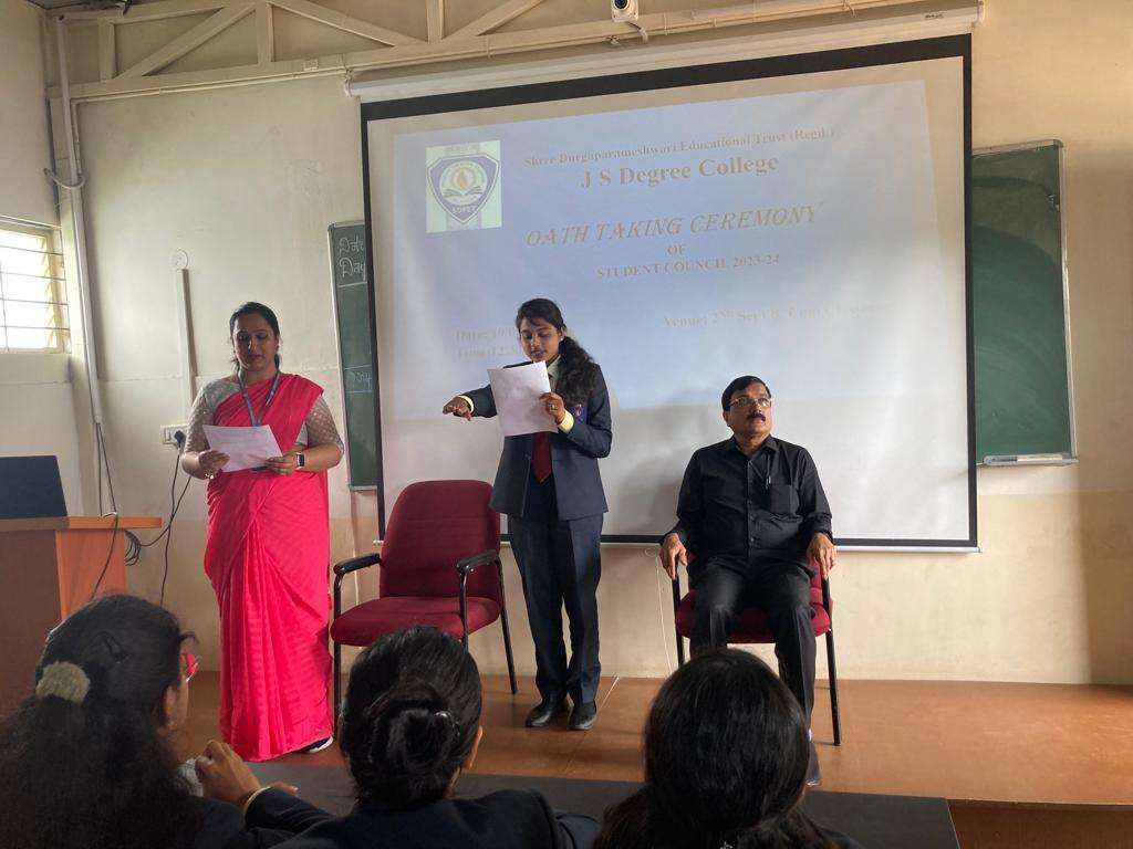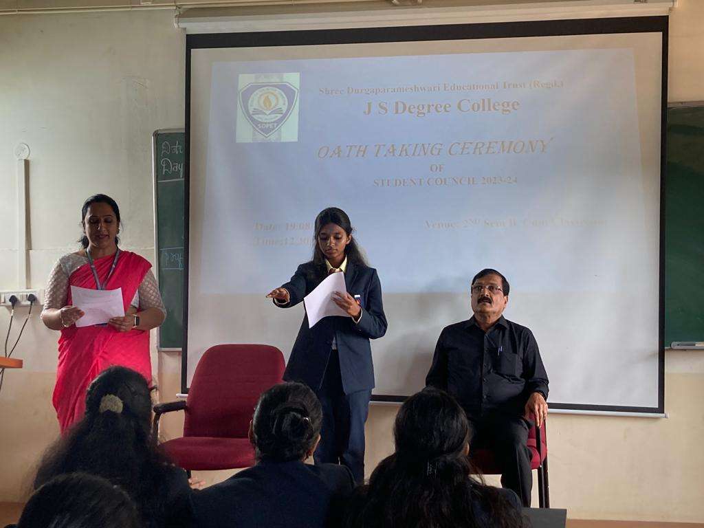 Student Council Members Mr. Manjunath G General Secretary III B.Com Ms. Yogitha SLadies Association- Secretary II B.Com Ms. Eishika S, Cultural Secretary II B.Com Mr. Chirag PrabhuCultural Secretary II B.Com Mr. Gurukiran SSports Secretary III B.Com Ms. Navya GSports Secretary I B.Com Ms. Pooja MDiscipline Secretary II B.Com Mr. Gowtham. MDiscipline Secretary II B.Com Bhargava KDiscipline Secretary II B.Com Chitrashree TJoint Secretary - Discipline I B.Com Valentina M.BLadies Association Secretary II B.Com Dhruthi MJoint Secretary - Ladies Association I B.Com Rahul KCultural Secretary II B.Com Aishwarya PrabhuJoint Secretary - Cultural I B.Com Kaushik K.SSports Secretary II B.Com Gurukiran SJoint Secretary - Sports I B.Com Student Council Oath Taking